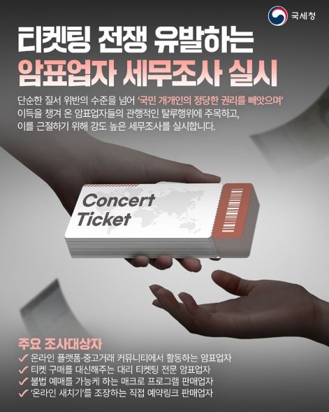 미디어라이프 중부신문 이도경 기자 | 단순한 질서 위반의 수준을 넘어 '국민 개개인의 정당한 권리를 빼앗으며' 이득을 챙겨 온 암표업자들의 관행적인 탈루행위에 주목하고, 이를 근절하기 위해 강도 높은 세무조사를 실시합니다.