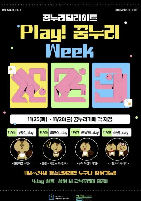 미디어라이프 중부신문 이종인 기자 | 의왕시청소년재단 산하 의왕시청소년수련관 꿈누리카페(▲고천점( 문화공원로 33), ▲내손점(복지로 109), ▲오전점(찬우물길 11), ▲백운밸리점(백운중앙로 74, 총 4개 지점))는 오는 11월 25일부터 28일까지 4일간 꿈누리딜라이트 『Play! 꿈누리 Week』를 진행한다고 밝혔다.