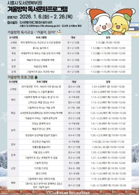 ‘겨울방학 프로그램’도 책을 기반으로 한 창의적이고 다양한 활동을 제공한다. 대표 프로그램으로는 ▲소래빛도서관 ‘내가 발견한 ‘우리’ 세상의 가장 빛나는 별’ ▲능곡도서관 ‘맛있는 문해력 요리’ ▲목감도서관 ‘그림책으로 떠나는 겨울 산책’ 등이 있으며, 아이들이 읽기 활동과 함께 창의·정서·문화 체험을 폭넓게 경험할 수 있도록 구성됐다.