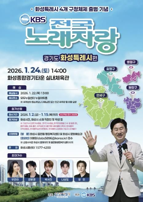 미디어라이프 중부신문 이종인 기자 | 화성특례시는 다음 달 2일부터 15일까지 ‘KBS 전국노래자랑’ 화성특례시편 참가자를 모집한다고 24일 밝혔다.
