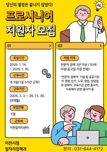 이천시 관계자는 “이번 프로시니어 모집은 경험 많은 중장년 인력이 지역 일자리 정책의 중요한 연결고리 역할을 하게 될 것”이라며 “전문성과 책임감을 갖춘 분들의 많은 관심과 참여를 바란다”라고 말했다.