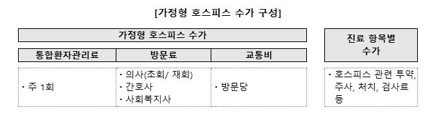 구체적으로, 의사·간호사·사회복지사의 환자 가정 방문 및 임종 돌봄, 전화상담 등 상시적 환자 관리서비스에 대한 수가를 인상하여 가정형 호스피스 전반에 대한 보상을 강화한다.