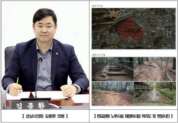 미디어라이프 중부신문 이종인 기자 | 성남시의회 국민의힘 김종환 의원(판교·백현·운중·대장동, 예산결산특별위원장)은 분당구 판교동 판교공원 일원 노후 산책로와 바닥포장 등을 정비하는 재정비공사가 본격 추진됨을 밝혔다.