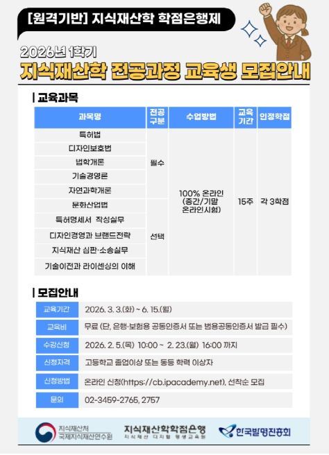 미디어라이프 중부신문 이도경 기자 | 지식재산처 국제지식재산연수원은 한국발명진흥회와 공동으로 2월 5일부터 23일까지 지식재산학 학점은행 과정에 대한 온라인 수강생을 모집한다.