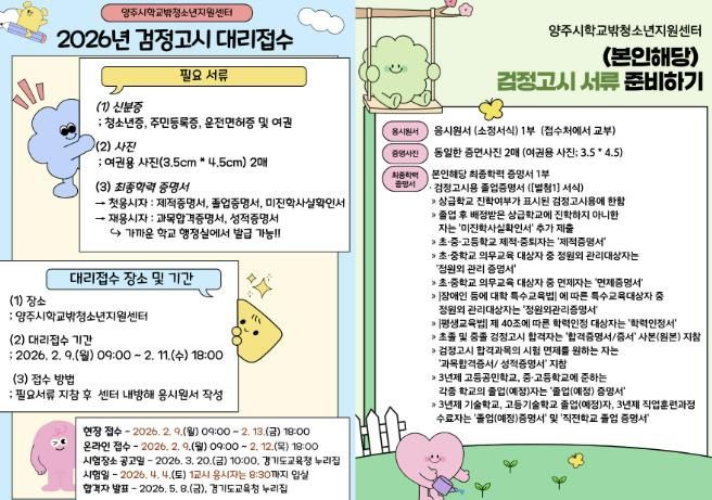 2026년도 제1회 검정고시는 4월 4일(토) 시행될 예정이다. 대리 원서 접수는 2월 9일(월)부터 11일(수)까지 3일간 양주시 꿈드림(고읍남로 205, 청소년문화의집 3층)에서 진행된다.