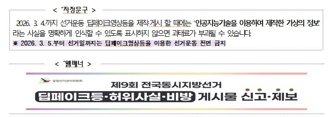 포털사 뉴스 댓글창, 인터넷 커뮤니티, AI사 홈페이지 등에'공직선거법'안내 자정문구를 표출하여 온라인 자율 규제 유도를 통해 위법행위를 사전에 예방하는 한편,주요 포털사와 인터넷 커뮤니티 홈페이지 등에 웹배너를 게시하여 위법게시물 신고·제보도 활성화한다.