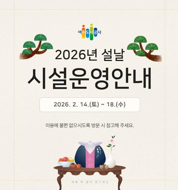 미디어라이프 중부신문 이종인 기자 | 여주도시공사가 다가오는 2026년 설 연휴를 맞아 시민과 귀성객들이 안전하고 편안한 명절을 보낼 수 있도록 주요 시설 운영시간 조정 및 특별 서비스를 시행한다고 밝혔다.