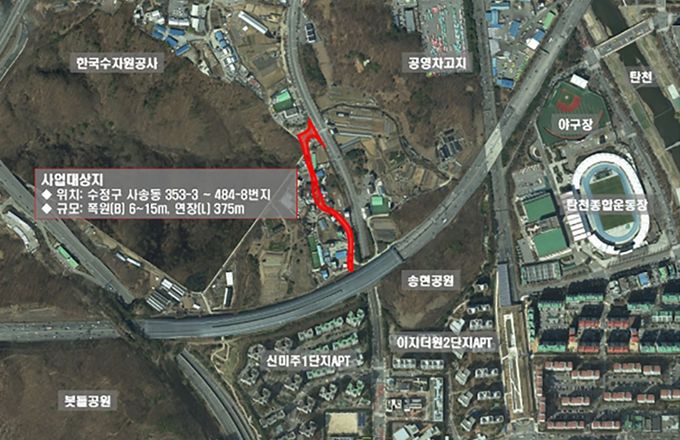 미디어라이프 중부신문 이종인 기자 | 성남시 수정구 사송동 353-3번지~484-8번지 일원에 오는 2030년까지 375m 길이의 도로 개설 사업이 추진된다.
