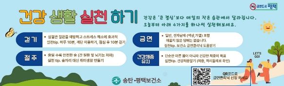 송탄보건소 관계자는 “큰 결심보다 매일의 작은 실천이 건강을 바꾼다”며 “걷기 한 걸음, 금연과 절주, 건강 체중 관리 등 실천이 가능한 것부터 시작해 달라”고 말했다.
