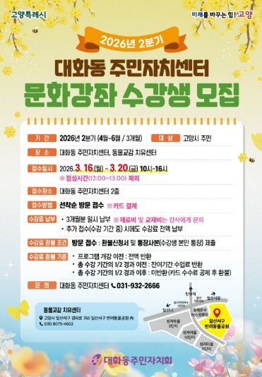 미디어라이프 중부신문 이종인 기자 | 고양특례시 일산서구 대화동 주민자치회는 주민들의 문화적 욕구를 충족하고 삶의 질을 높이기 위해 오는 3월 16일부터 20일까지 ‘2026년 2분기 문화강좌’ 수강생을 모집한다.