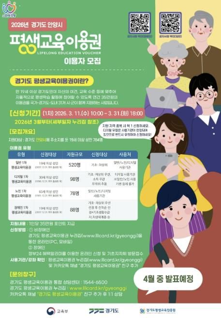 미디어라이프 중부신문 이종인 기자 | 안양시는 저소득층, 어르신, 장애인 등 교육 취약계층의 평생학습 기회를 보장하기 위한 총 3억 원 규모의 ‘2026년 평생교육 이용권(바우처) 지원사업’을 추진한다고 11일 밝혔다.