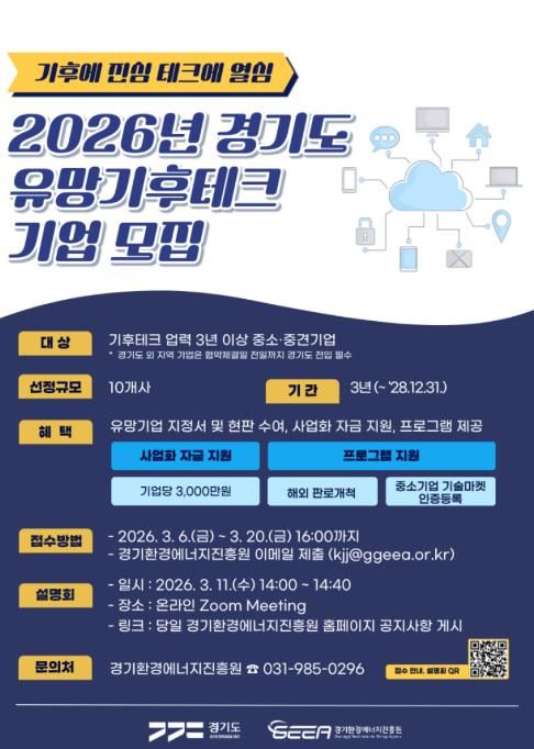 미디어라이프 중부신문 이종인 기자 | 경기도와 경기환경에너지진흥원이 기후위기 대응을 선도할 혁신 기술 보유 기업을 발굴하기 위해 오는 3월 20일까지 ‘2026년 경기도 유망 기후테크 기업’ 10곳을 모집한다.