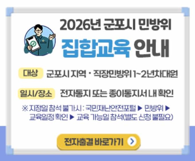 미디어라이프 중부신문 이종인 기자 | 군포시는 민방위대원의 비상 시 대응 역량 강화를 위해 ‘2026년 민방위 기본교육’을 실시한다.