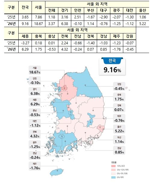 전국 평균(9.16%)보다 높게 상승한 시ㆍ도는 서울(18.67%)이 유일하다. 서울을 제외한 지역의 가격 변동률은 3.37%다.