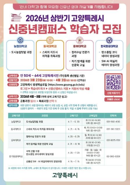 미디어라이프 중부신문 이종인 기자 | 고양특례시는 ‘2026년 고양시 신중년캠퍼스’ 상반기 교육과정 학습자 180명을 오는 3월 23일부터 모집한다.