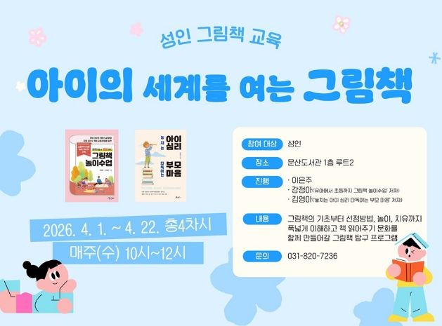 미디어라이프 중부신문 이종인 기자 | 파주시 문산도서관은 그림책의 가치와 활용 방법을 이해하고, 지역사회에 책 읽어주기 문화를 확산하기 위한 그림책 교육 프로그램 ‘아이의 세계를 여는 그림책’을 오는 4월 1일부터 4월 22일까지 운영한다.