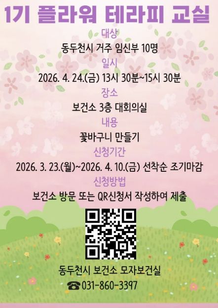 이번 플라워테라피 태교 교실은 4월 24일 보건소 3층 대회의실에서 진행하며 신청 기간은 오는 10일까지로 동두천시 보건소에 등록된 임신부를 선착순 모집한다.
