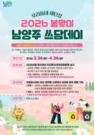 미디어라이프 중부신문 김민정 기자 | 남양주시는 3월 24일부터 4월 24일까지 시 전역에서‘우리동네 새단장 봄맞이 남양주 쓰담데이’집중 추진기간을 운영한다고 밝혔다.