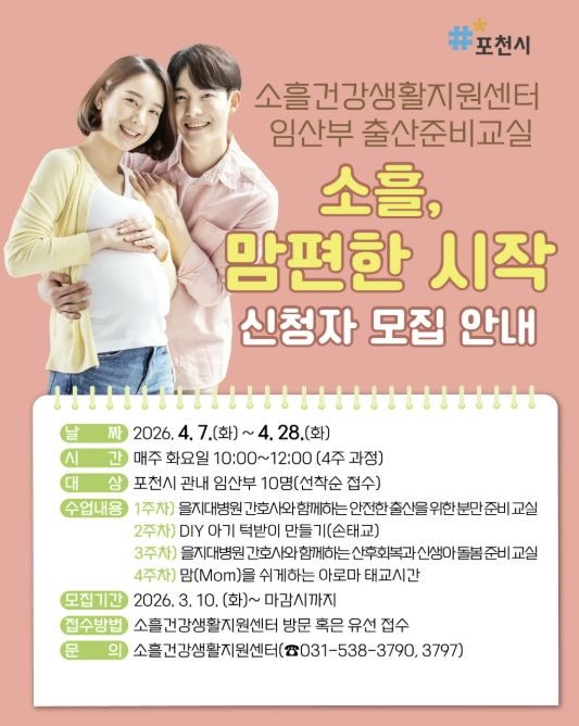 미디어라이프 중부신문 이도경 기자 | 포천시 소흘건강생활지원센터는 임산부의 건강한 임신과 안전한 출산을 지원하기 위해 임산부 출산준비교실 ‘소흘, 맘편한 시작’ 참여자를 모집한다.