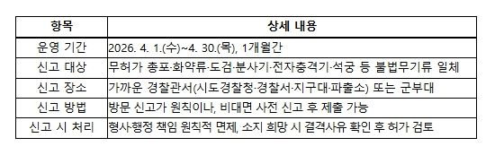 미디어라이프 중부신문 이도경 기자 | 경찰청은 불법무기류로 인한 범죄와 사고를 미리 방지하기 위하여 국방부 및 행정안전부와 합동으로 4월 1일부터 30일까지 한 달간 '2026년 1차 불법무기류 자진신고 기간'을 운영한다.