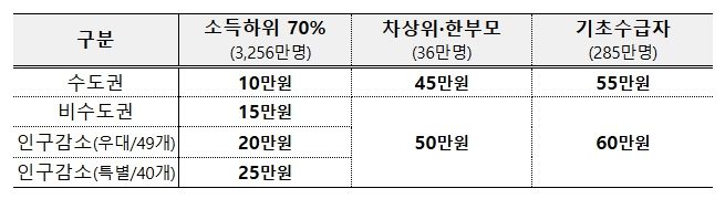 소득 하위 70% 국민에게 거주 지역별로 수도권 10만원, 비수도권 15만원, 인구감소 우대지역 20만원, 인구감소 특별지역 25만원을 지급할 예정이며, 한부모가족・차상위계층은 45만원, 기초생활수급자는 55만원을 지급하되 비수도권에 거주하는 경우에는 1인당 5만원을 추가 지급한다.