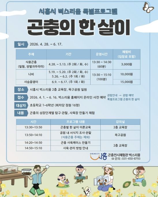 미디어라이프 중부신문 이종인 기자 | 시흥시 곤충체험전시관 ‘벅스리움’은 오는 4월 28일부터 6월 17일까지 초등학생을 대상으로 특별프로그램 ‘곤충의 한 살이’를 운영한다.