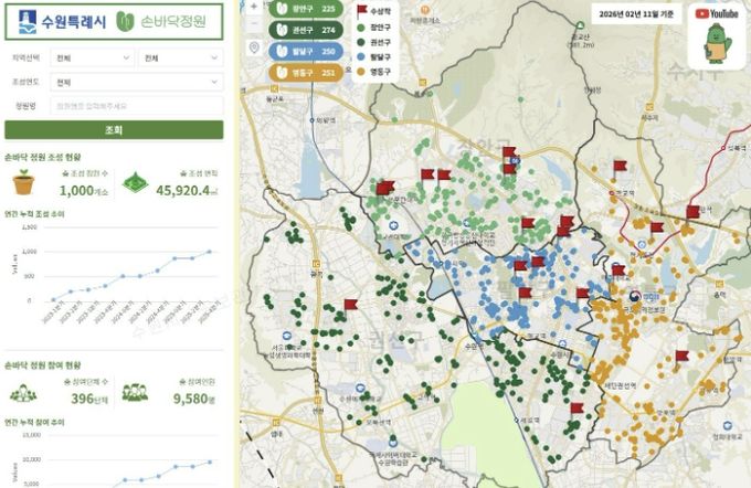 2024년에는 곳곳에 조성한 새빛수원 손바닥정원의 정보를 한눈에 볼 수 있는 온라인 지도 ‘지도로 보는 손바닥정원’을 구축했다. 손바닥정원 위치가 수원시 지도 위에 점으로 표시돼 있다.