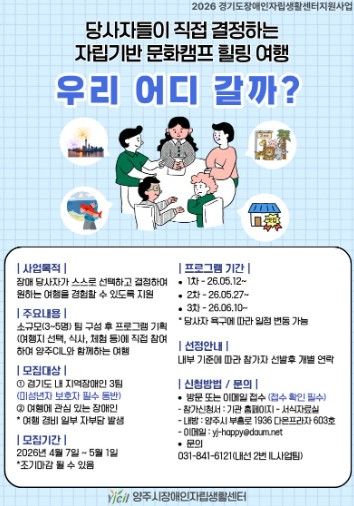 미디어라이프 중부신문 이도경 기자 | 양주시장애인자립생활센터에서는 장애인 당사자가 직접 선택하고 결정하는 자립 기반 힐링 여행을 목적으로 하는 지역 장애인 문화캠프 [우리 어디 갈까?] 참가자를 모집한다.