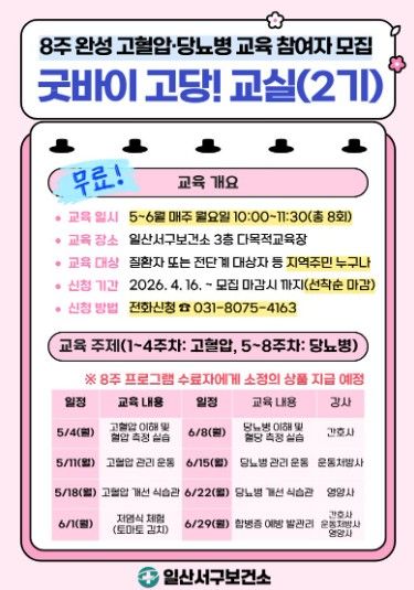 미디어라이프 중부신문 최부일 기자 | 고양특례시 일산서구보건소는 지역주민의 고혈압·당뇨병 예방관리를 위해‘굿바이 고당! 교실’ 2기 참여자를 오는 16일부터 모집한다.