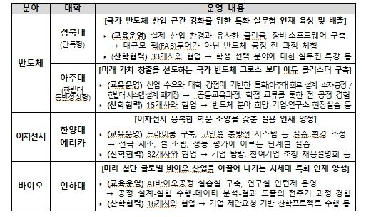 ‘첨단산업 특성화대학 재정지원사업’은 첨단산업 성장에 발맞춰, 분야별 특화 인재양성을 위한 특성화대학을 집중 육성하는 사업이다. 2023년 반도체 분야에서 시작하여 이차전지, 바이오 분야로 확대했으며, 2026년에는 피지컬 인공지능(AI) 시대 차세대 기술 주권 확보를 위하여 로봇 분야를 신설했다.