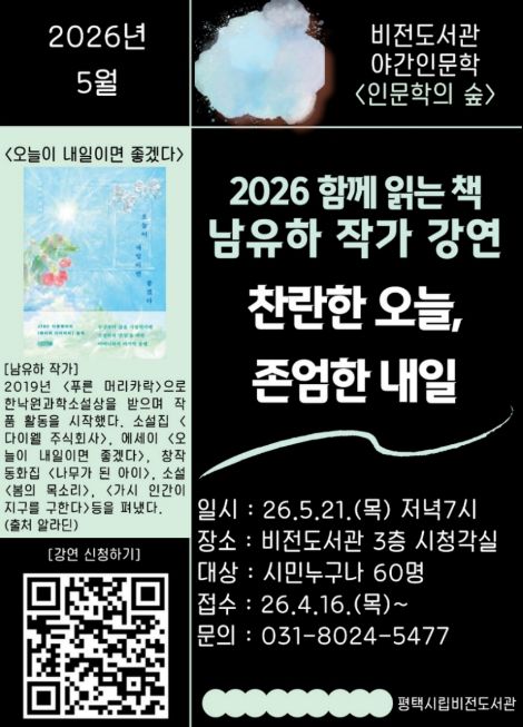 미디어라이프 중부신문 이종인 기자 | 평택시립 비전도서관은 오는 5월 21일 저녁 7시 남유하 작가를 초청하여 ‘찬란한 오늘, 존엄한 내일’을 주제로 야간 인문학 강연을 진행한다.