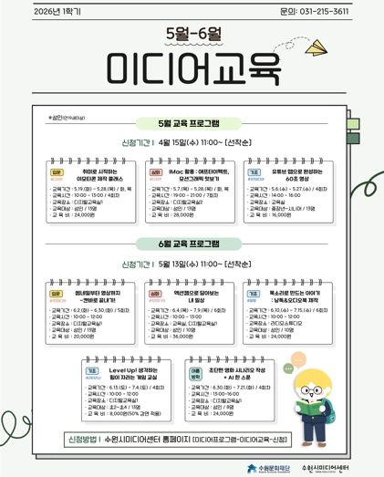 또한, 학기제 교육 프로그램으로는 5월 ▲취미로 시작하는 이모티콘 제작 클래스 ▲IMac 활용 : 애프터이펙트, 모션그래픽 맛보기 등 디자인 중심 교육이 개설되며, 6월에는 ▲썸네일부터 영상까지 캔바로 끝내기! ▲액션캠으로 담아보는 내 일상 등 1인 미디어를 주제로 한 교육을 개설한다. 월별 프로그램 접수일과 프로그램별 수강료가 상이하므로 사전 확인이 필요하다. 미디어 교육 프로그램에 관한 상세 정보 및 교육 신청은 수원시미디어센터 홈페이지를 통해 확인할 수 있다.