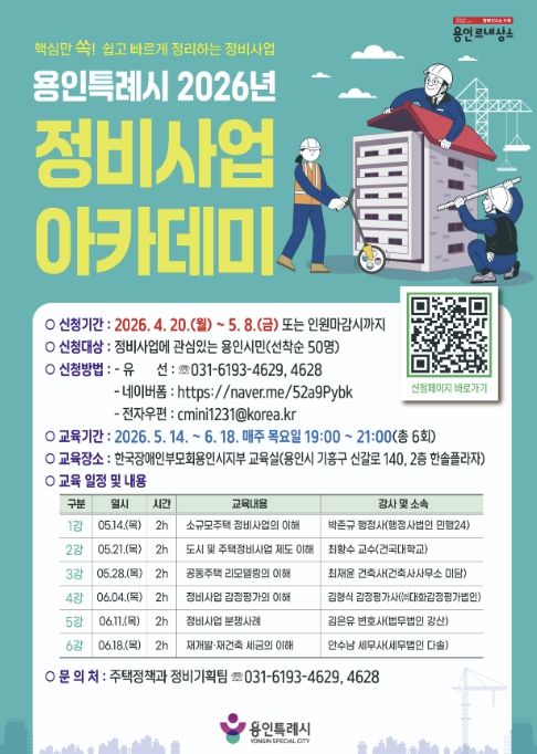 미디어라이프 중부신문 이종인 기자 | 용인특례시는 4월 20일부터 5월 8일까지 ‘2026년 정비사업 아카데미’ 수강생을 모집한다.