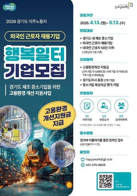 미디어라이프 중부신문 이종인 기자 | 경기도와 경기도일자리재단은 도내 외국인 근로자를 고용한 중소 제조기업을 대상으로 ‘2026년 경기도 이주노동자 행복일터 선정사업’ 참여기업을 모집한다고 20일 밝혔다.