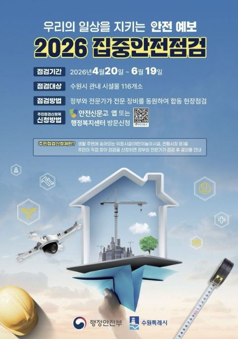 미디어라이프 중부신문 이종인 기자 | 수원특례시가 안전사고를 예방하고, 시민의 안전 의식을 고취하기 위해 20일부터 6월 19일까지 ‘2026년 집중안전점검’을 한다.