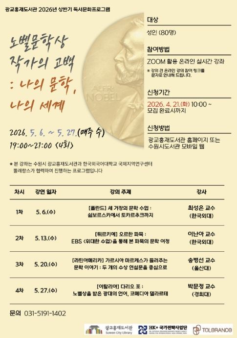 미디어라이프 중부신문 이종인 기자 | 수원시 광교홍재도서관이 한국외국어대학교와 협력해 진행하는 2026년 세계문화기행 시리즈 1편 ‘노벨문학상 작가의 고백 : 나의 문학, 나의 세계’ 강좌를 수강할 시민을 모집한다.