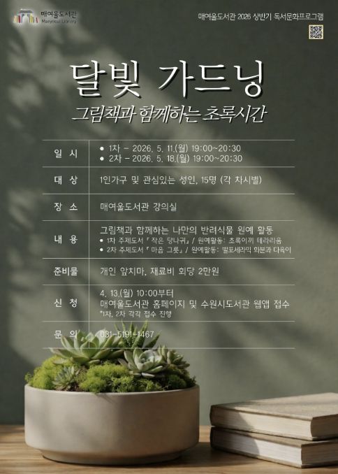 매여울도서관 관계자는 “그림책과 식물을 매개로 일상에 여유와 위로를 전하는 프로그램”이라며 “많은 시민들이 참여해 힐링의 시간을 보내길 바란다”고 말했다.