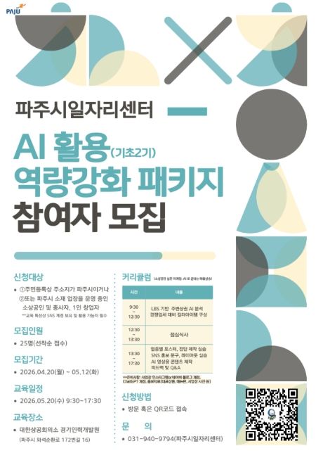 모집 기간은 4월 20일부터 5월 12일까지이며, 교육은 5월 20일 경기인력개발원에서 하루 7시간 과정으로 진행된다. 모집 대상은 파주시 관내 소상공인으로, 총 25명을 선착순 모집한다. 자세한 사항은 파주시청 누리집을 참고하거나 파주시 일자리센터로 문의하면 상세히 안내받을 수 있다.