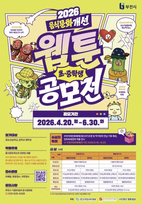 미디어라이프 중부신문 이종인 기자 | 부천시는 4월 20일부터 6월 30일까지 ‘2026년 음식문화개선 초중학생 웹툰·캐릭터 공모전’을 연다. 이번 공모전은 학생들이 일상 속 음식문화를 주제로 직접 창작에 참여함으로써 올바른 식문화에 대한 인식을 높이기 위해 매년 추진되고 있다.