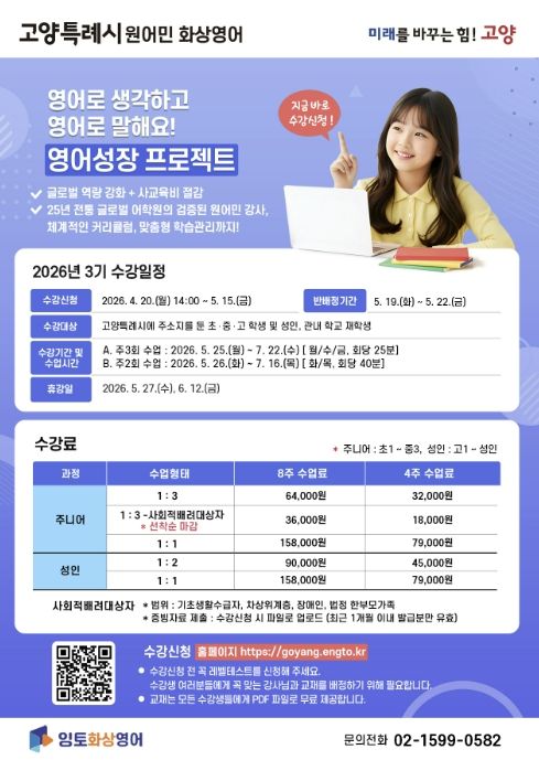 미디어라이프 중부신문 최부일 기자 | 고양특례시는 글로벌 역량 강화와 사교육비 부담 완화를 위한 ‘원어민 화상영어’ 프로그램의 3기 수강생을 4월 20일부터 5월 15일까지 모집한다.