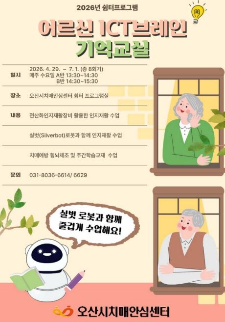 미디어라이프 중부신문 이종인 기자 | 오산시치매안심센터는 오는 4월 29일부터 경증 치매환자를 위한 쉼터 프로그램 ‘ICT 브레인 기억 교실’을 운영한다고 밝혔다.