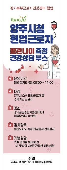 건강상담 부스는 오는 4월 22일 오전 9시, 양주시 소속 현업근로자 및 수탁기관 근로자 400여 명을 대상으로 하는 정기 안전보건교육 현장(경기섬유종합지원센터 지하 1층 대강당 로비)에서 첫선을 보인다.