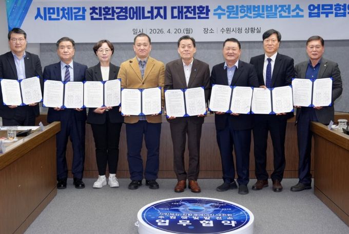 수원시와 수원도시공사, 수원시민햇빛발전 사회적협동조합, 수원에너지 협동조합, 기후시민에너지협동조합, 수원상공회의소, 수원산업단지관리공단, 아이비케이(IBK) 기업은행 동수원지점은 20일 시청 상황실에서 업무협약을 체결하고, 수원햇빛발전소 건설·활성화를 위해 협력하기로 했다.