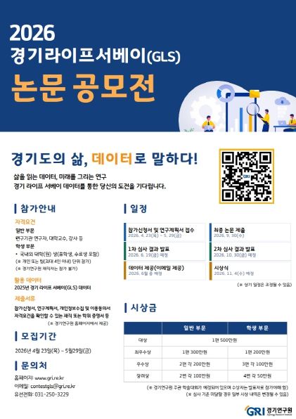 경기연구원은 이번 조사를 통해 확보한 대규모 데이터를 기반으로 데이터 중심의 과학적 행정을 뒷받침하고, 증거 기반 연구 역량을 한층 강화하는 데 주력할 방침이다. 연구 데이터의 지속가능성을 확보하고 창의적인 분석 아이디어를 통해 정책 활용도를 높이기 위해 ‘2026년 경기 라이프 서베이(GLS) 논문 공모전’을 개최할 예정이며, 이를 통해 도출된 제안과 분석 결과를 실질적인 정책 근거자료로 활용할 계획이다.