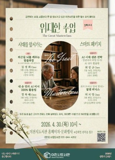 미디어라이프 중부신문 최부일 기자 | 이천시립도서관은 오는 4월 30일부터 2026년 상반기 시민강사 프로그램 ‘위대한 수업’의 1차 수강생을 모집한다고 밝혔다.