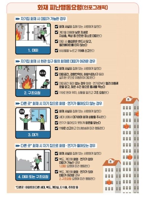미디어라이프 중부신문 이도경 기자 | 소방청은 최근 아파트 화재가 잇따라 발생함에 따라, 인명피해를 최소화하기 위해 무리한 대피보다는 화재 상황을 먼저 판단하고 행동하는 상황별 피난 행동요령을 철저히 준수해 줄 것을 당부한다고 17일 밝혔다.