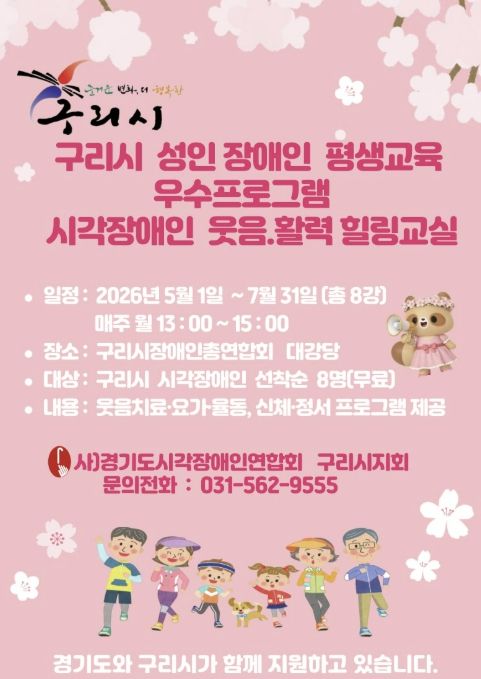미디어라이프 중부신문 최부일 기자 | 사단법인 경기도시각장애인연합회 구리시지회는 구리시와 경기도의 지원을 받아 2026년 5월부터 ‘시각장애인 웃음·활력 힐링 교실’을 운영할 예정이라고 밝혔다.