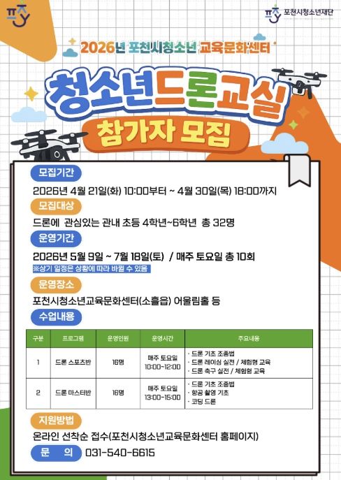 미디어라이프 중부신문 최부일 기자 | (재)포천시청소년재단 포천시청소년교육문화센터는 오는 4월 21일부터 30일까지 관내 초등학교 4학년부터 6학년을 대상으로 청소년드론교실 1기 참가자를 선착순으로 모집한다고 밝혔다.