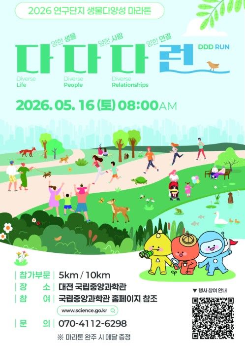 미디어라이프 중부신문 이도경 기자 | 과학기술정보통신부 국립중앙과학관은 생물다양성의 소중함을 온몸으로 체감하고 일상 속 친환경 실천 문화를 확산하기 위한 2026 연구단지 생물다양성 마라톤 ‘다다다런(다양한 생물, 다양한 사람, 다양한 연결)’을 개최한다고 밝혔다.