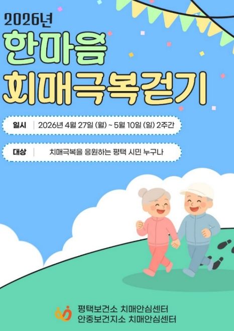 미디어라이프 중부신문 이종인 기자 | 평택보건소 치매안심센터와 안중보건지소 치매안심센터에서는 지역 주민의 치매 예방과 인식개선을 위해 녪년 한마음 치매극복 걷기 행사’를 오는 4월 27일부터 5월 10일까지 2주간 진행한다.